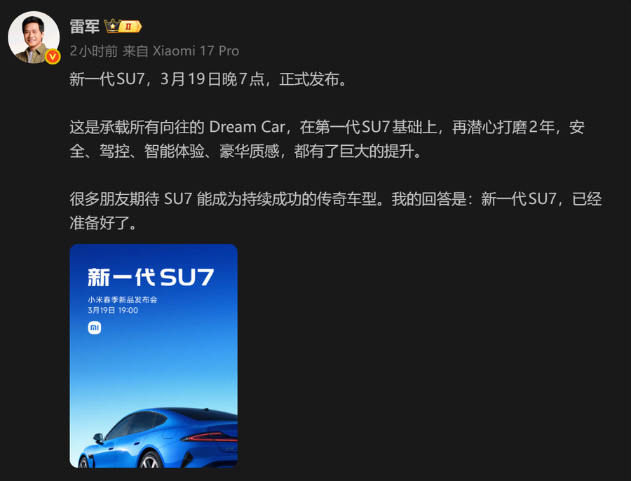 雷军今日在微博正式宣布,新一代小米SU7将于3月19日19:00正式发布。
