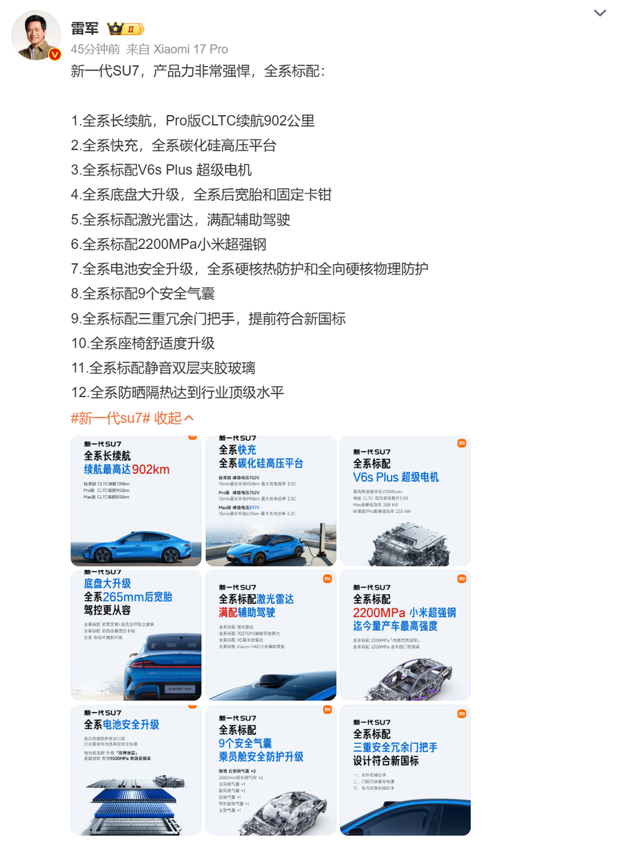 他表示,这是承载所有向往的Dream Car,在第 一代SU7基础上再潜心打磨两年,在安全、驾控、智能体验和豪华质感等方面都实现了巨大提升。雷军强调:“很多朋友期待SU7能成为持续成功的传奇车型。我的回答是:新一代SU7,已经准备好了。”