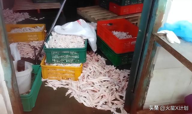 大量鸡爪被直接堆放在潮湿肮脏的地面上,扫帚、铁锹就压在鸡爪上,甚至有工人踩踏过去,也只是随手把鸡爪捡起来扔回筐里。